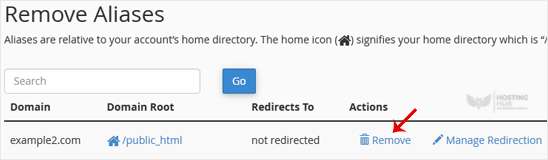 3. Under Remove Aliases, locate the parked domain name and click on Remove.