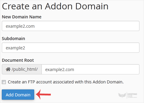 Lăsați opțiunea Creează un cont FTP asociat cu acest domeniu addon așa cum este.