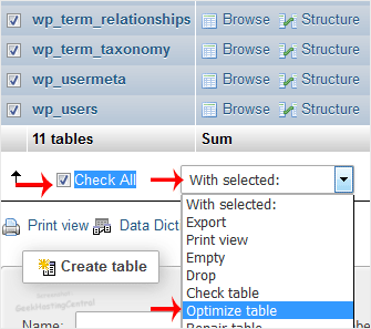 4. Derulați în jos și marcați Selectează toate. Faceți clic pe opțiunea din meniu derulant și selectați Optimizează tabelele.