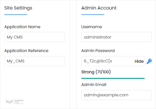 • Admin Username: Your new PyroCMS username (for security reasons, do not use the administrator or the admin username).