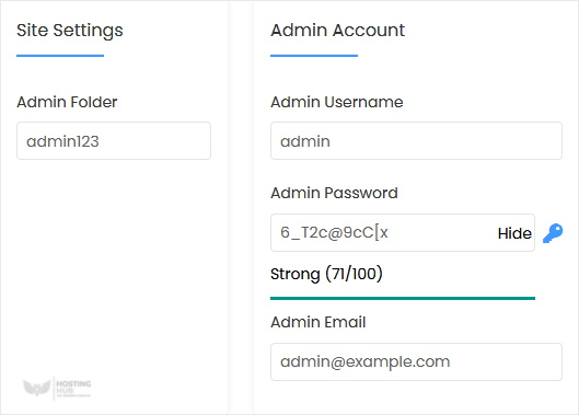 - Admin-Ordner: Geben Sie den Namen Ihres Admin-Ordners ein, wie z.B. admin123.