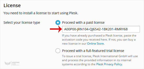 Step 4: Under the License section, should you have a license key, enter your Plesk Onyx license key or use a trial license by selecting a full-featured trial license.