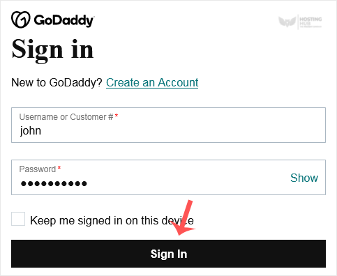 2. Geben Sie den Benutzernamen oder die Kunden-ID und das Passwort Ihres GoDaddy-Kontos ein. Klicken Sie dann auf Anmelden.