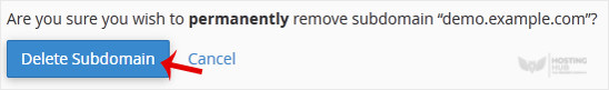 5. Zur Bestätigung klicken Sie auf Delete Subdomain, um Ihre Subdomain dauerhaft zu entfernen.