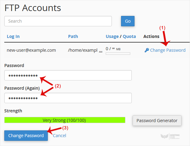 3. Unter der Liste der FTP-Konten klicken Sie auf Passwort ändern und geben ein neues Passwort ein. Alternativ verwenden Sie den Passwort-Generator, um eines zu generieren.
