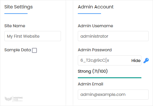- Admin Username: Ihr neuer Concretecms-Benutzername (aus Sicherheitsgründen verwenden Sie nicht den Benutzernamen administrator oder admin).