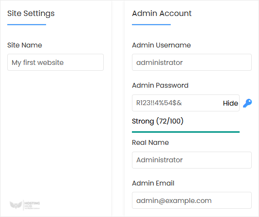 - Admin Username: Ihr neuer e107-Benutzername (aus Sicherheitsgründen verwenden Sie nicht den Benutzernamen administrator oder admin).