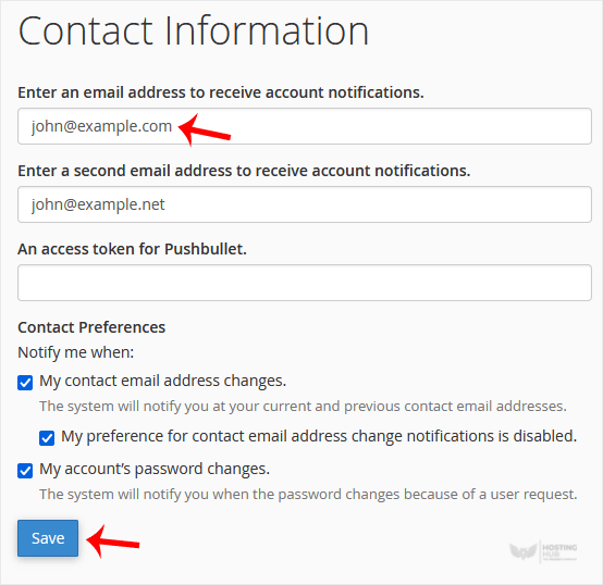 Wenn Sie eine Benachrichtigung erhalten möchten, wenn Ihr Festplattenkontingent, Ihr Bandbreitennutzungslimit erreicht wird, oder wenn Sie die Kontaktinformationen in cPanel aktualisieren möchten, folgen Sie diesen Schritten.