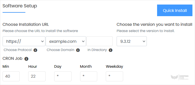 • Choose Installation URL: Alegeți protocolul/domeniul corespunzător. În câmpul „In Directory", dacă doriți să instalați într-un director, de exemplu, example.com/director, introduceți numele directorului. În caz contrar, vă rugăm să lăsați câmpul necompletat pentru a instala pe domeniul principal, de exemplu, example.com.