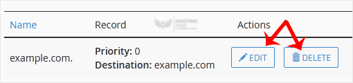 5. Localizați înregistrarea CNAME pe care doriți să o editați sau să o eliminați. Dacă doriți să editați o înregistrare CNAME, faceți clic pe Edit. Modificați detaliile și faceți clic pe Save Record. Eliminarea unei înregistrări se poate face cu opțiunea Delete.